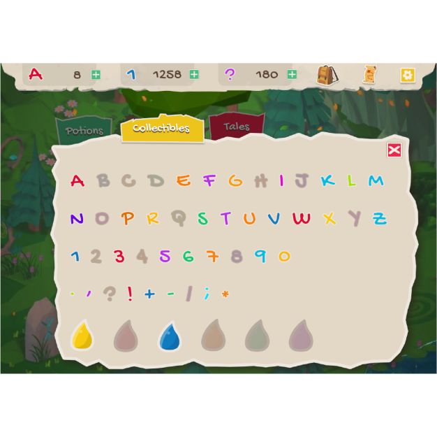 Game's adventure aspect, highlighting the collection of numbers, characters, letters, colors, and animals to fix fairytales and stories.